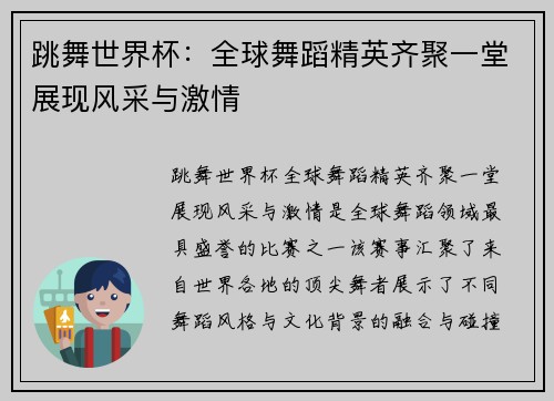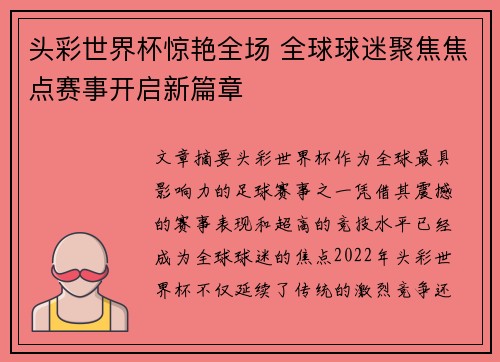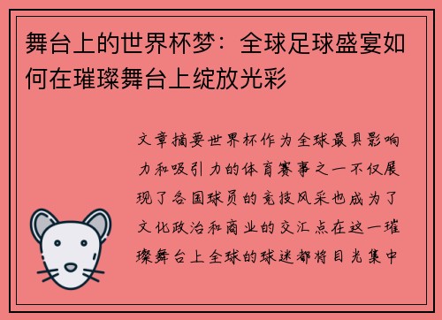璀璨世界杯盛宴燃情四海 见证历史荣耀与梦想的碰撞