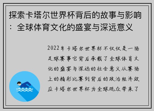 文章摘要:李晨作为中国娱乐圈的知名人物,不仅在影视圈中取得了巨大的成功,同时也在体育赛事中展示了他独特的魅力与影响力。尤其是在世界杯这一全球瞩目的盛事中,李晨的助力不仅为赛事增添了亮点,更通过多种形式参与到背后复杂的策划与推动中。本文将从四个方面详细回顾李晨在世界杯中的精彩瞬间与幕后故事:第一,李晨如何通过个人品牌与赛事建立深度合作,带动中国体育文化的国际化;第二,李晨与世界杯的相关活动对球迷文化...