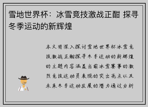 文章摘要:首脑世界杯作为全球智力与战略的顶尖对决,汇聚了来自世界各地的精英选手。这一赛事不仅仅是对参赛者智力的挑战,更是一场策略与心理博弈的较量。通过深入分析赛事的组织结构、参赛者的技能要求、心理因素以及赛事的影响力等方面,我们可以全面了解这一智力竞技盛宴。首先,赛事的组织与规则设定为选手提供了一个公平而又充满挑战的舞台;其次,顶尖选手的选拔和准备过程展现了赛事的严谨性和高水平;再者,心理素质在决...
